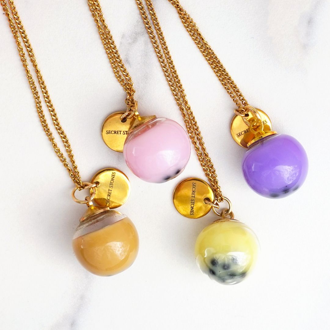 Katra kaklarota rotāta ar trīsdimensiju piekariņu burbuļtējas formā – pieejama dažādos gardos toņos, kas atgādina iecienītos dzērienus: zemeņu, melleņu, mango vai klasisko tēju. Zelta ķēdīte un gravēta plāksnīte ar “Secret Stones” logotipu piešķir dizainam izsmalcinātību un siltu spīdumu.